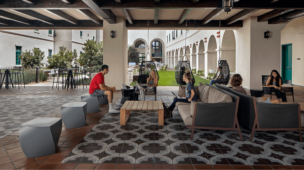 Huāxyacac Hall is a 200,000-square-foot first-year residence hall that expands San Diego State University’s campus housing network. The six-story facility, designed in Mission Revival style, provides housing for approximately 600 students and includes community lounges, study rooms, a communal kitchen, and outdoor terraces. An adjacent courtyard features a separate 8,000-square-foot amenity building that houses the Aztec Market.